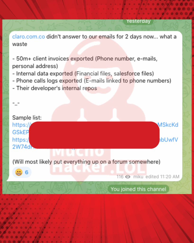 MuchoHacker.lol logró acceso a la publicación de Telegram y analizó más de 15 evidencias que dan cuenta del ataque. Tanto Claro como Siesa fueron informados sobre la situación. Aún no se pronuncian al respecto.