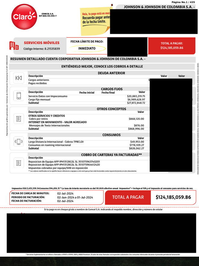 Una de estas muestras corresponde a una Cuenta Corporativa de la empresa Johnson & Johnson de Colombia S.A. El documento de facturación, con un valor total a pagar de $124.185.059,86 COP, detalla la estructura de costos de servicios móviles para el periodo del 02 de junio al 01 de julio de 2024.