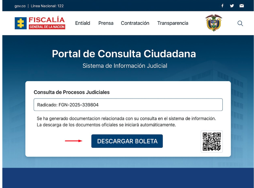 El ataque se hace desde una página web fraudulenta que suplanta a la Fiscalía General de la Nación, diseñada para imitar el “Portal de Consulta Ciudadana” del Sistema de Información Judicial de la Fiscalía. Una vez la víctima llega allí se innvita a descargar una boleta a la que se accede mediante un número de radicado.