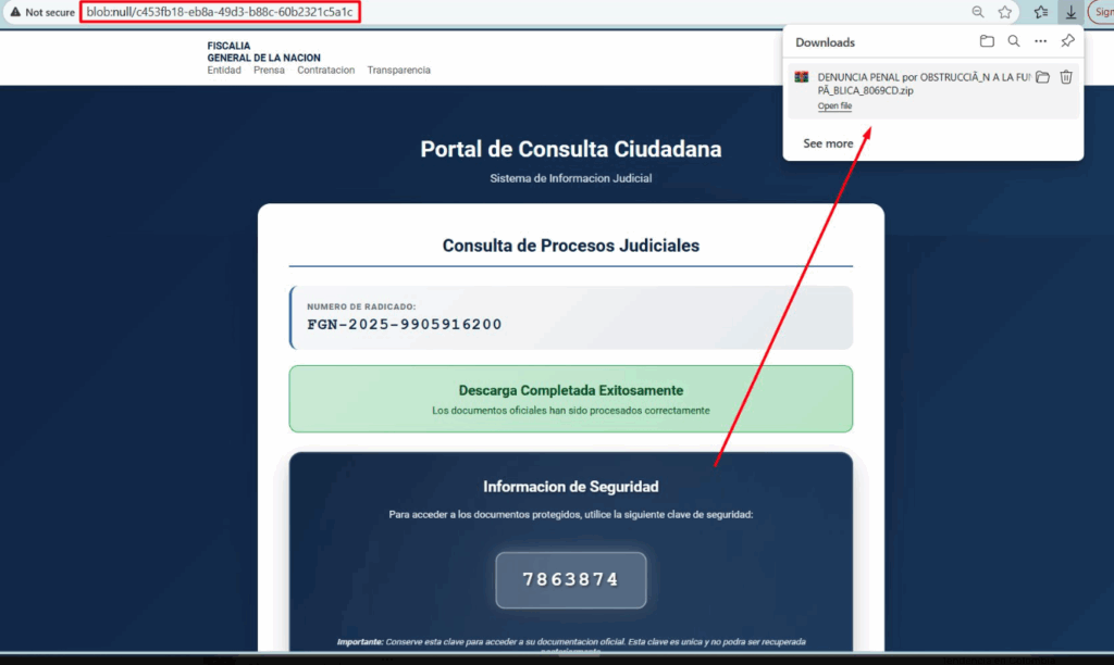 Una vez la víctima ingresa el radicado descargará un archivo ZIP que se puede descomprimir con una clave que da el propio portal falso.