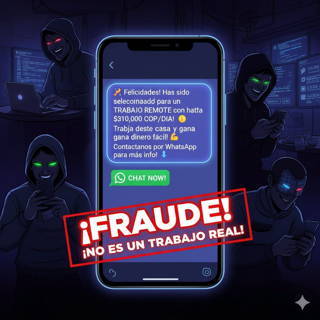 - Mensajes de texto fraudulentos ofrecen trabajos falsos en ColombiaSe ha detectado una estafa mediante mensajes de texto que prometen trabajos con salarios de hasta 310,000 COP diarios. Los estafadores buscan engañar a personas que buscan empleo, invitándolas a contactar por WhatsApp para robar información personal o dinero. Conoce cómo protegerte.